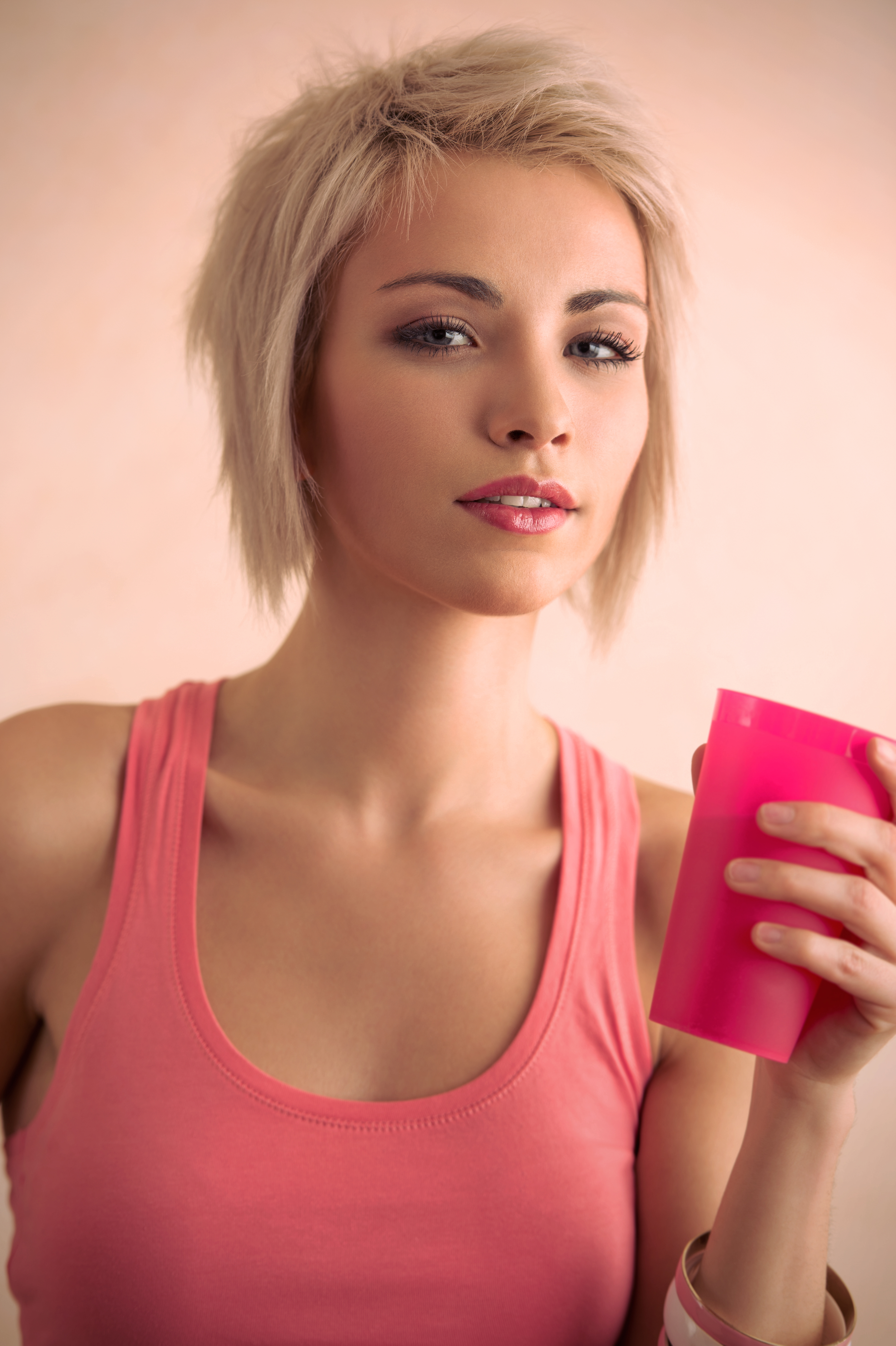 Hot blond girl with short hair holding plastic cup and looking at camera